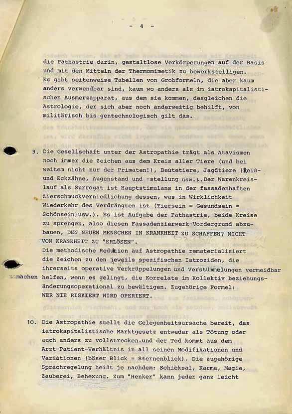 PATHASTRIE (kosmisch-sozialrevolutionärer Gegensatz) ÜBERWINDET ASTROPATHIE (fatalistischer Ansatz). Krankheit Prinzip, Krankheit mit Krankheit das Mittel, die Ebene, Vollendung in Krankheit das Resultat, aus sich selbst zehrend, immun (Krankheit = Waffe der Waffen), Gattungs-Selbst durch Selbstbegattung.